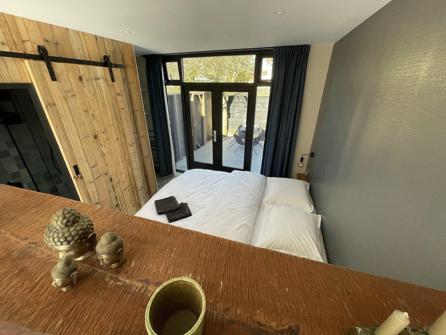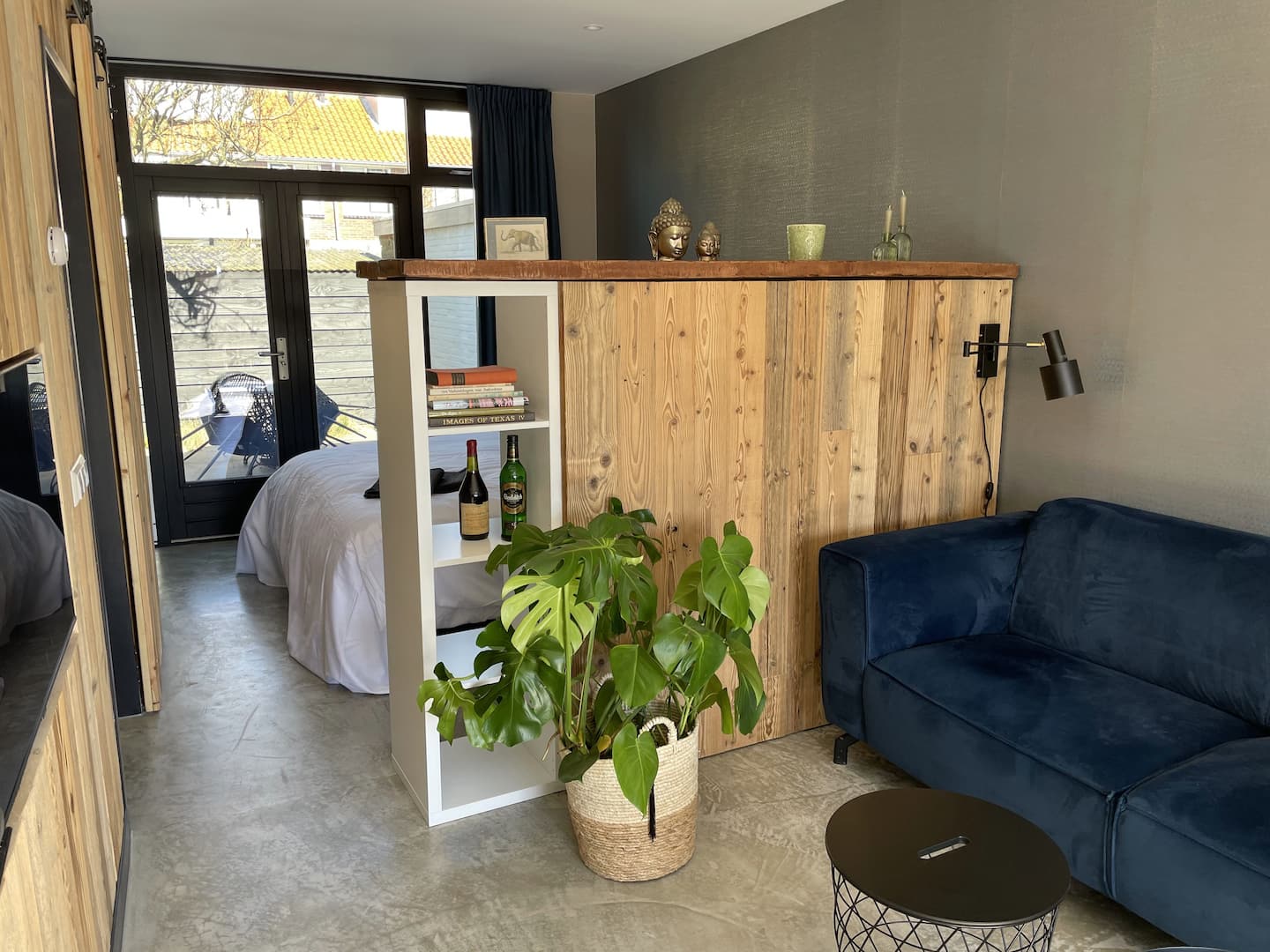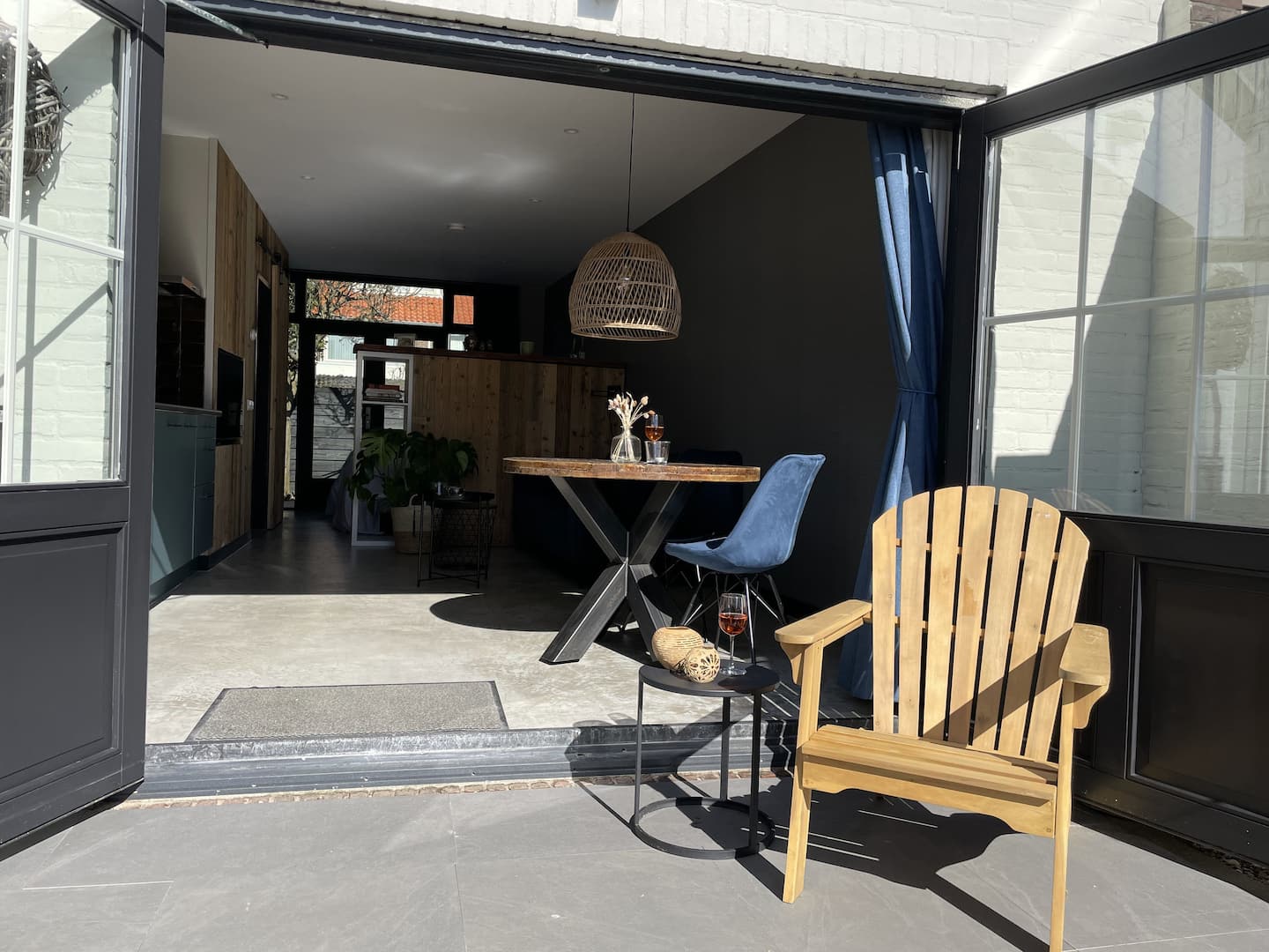 Een eigentijdse studio gemaakt met prachtige materialen. Met openslaande deuren aan zowel de voorzijde als aan de achterkant geniet u in deze studio optimaal van het buitenleven.