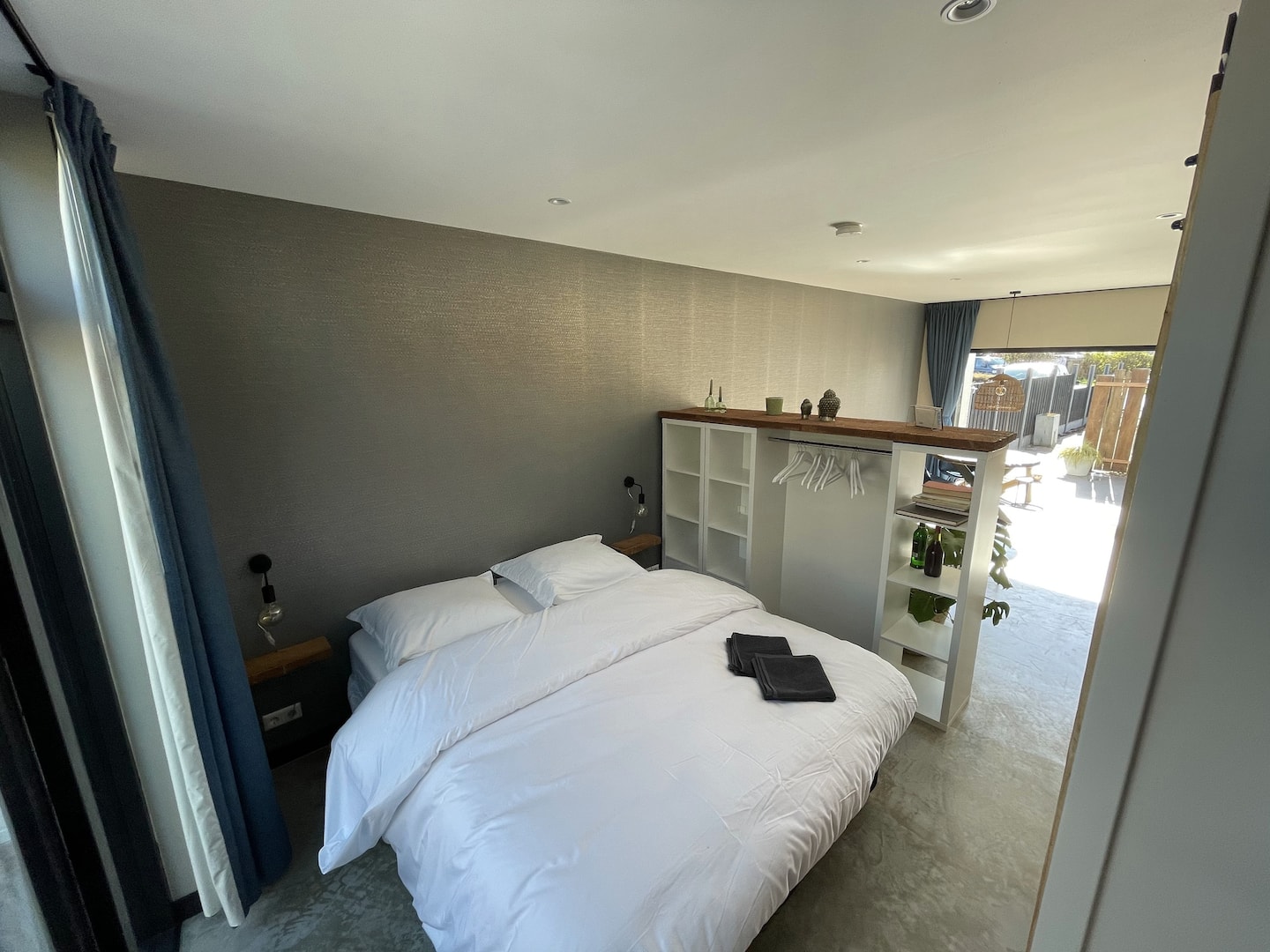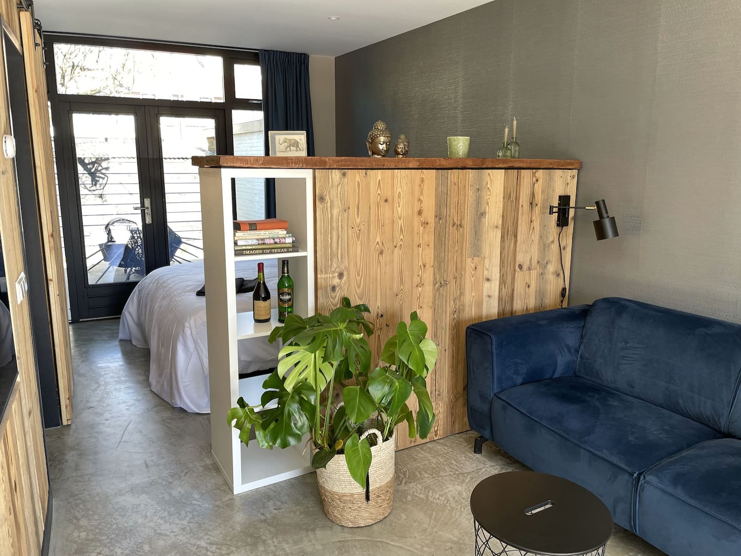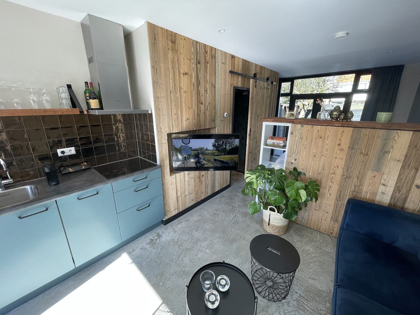 Een eigentijdse studio gemaakt met prachtige materialen. Met openslaande deuren aan zowel de voorzijde als aan de achterkant geniet u in deze studio optimaal van het buitenleven.