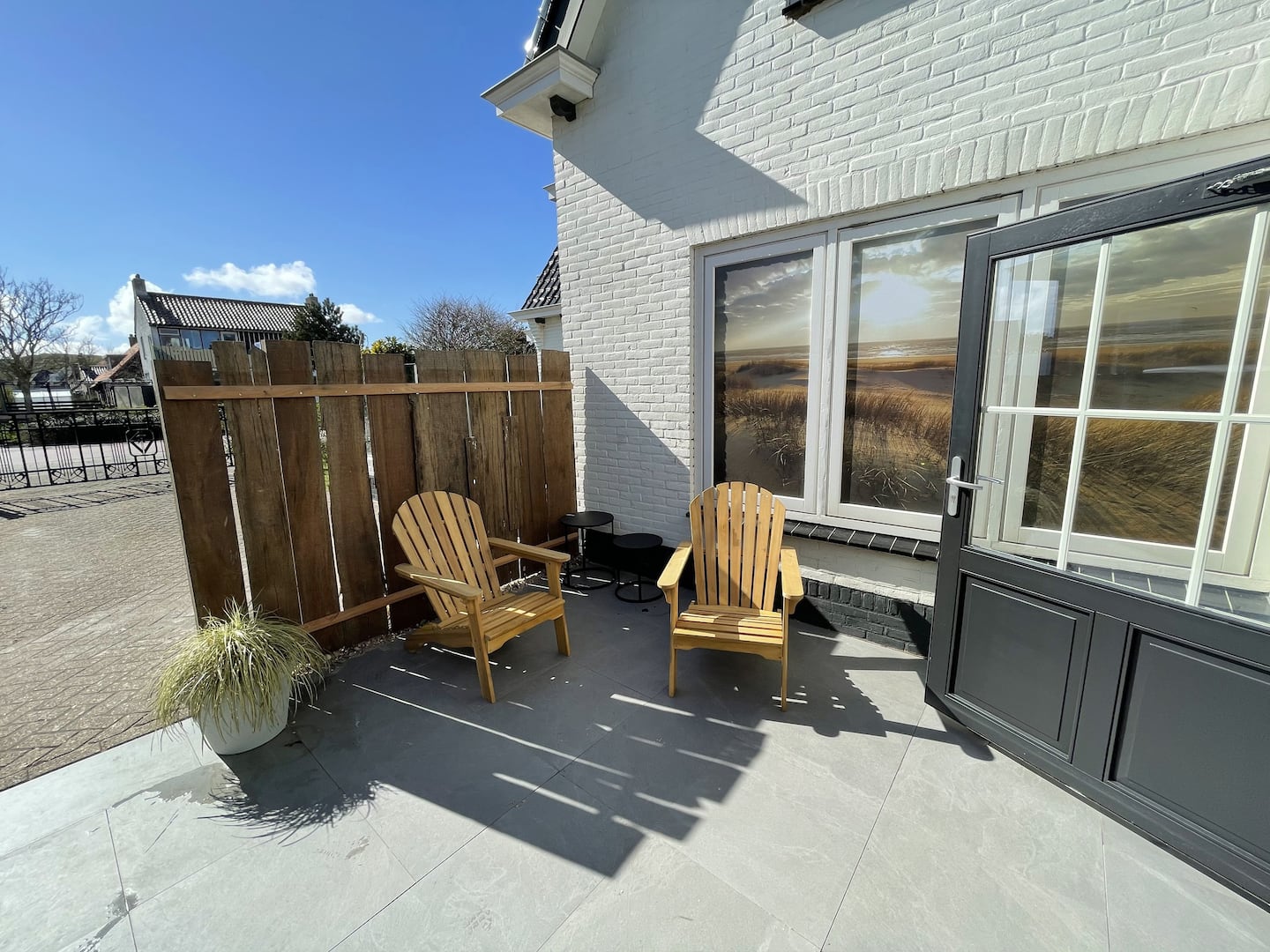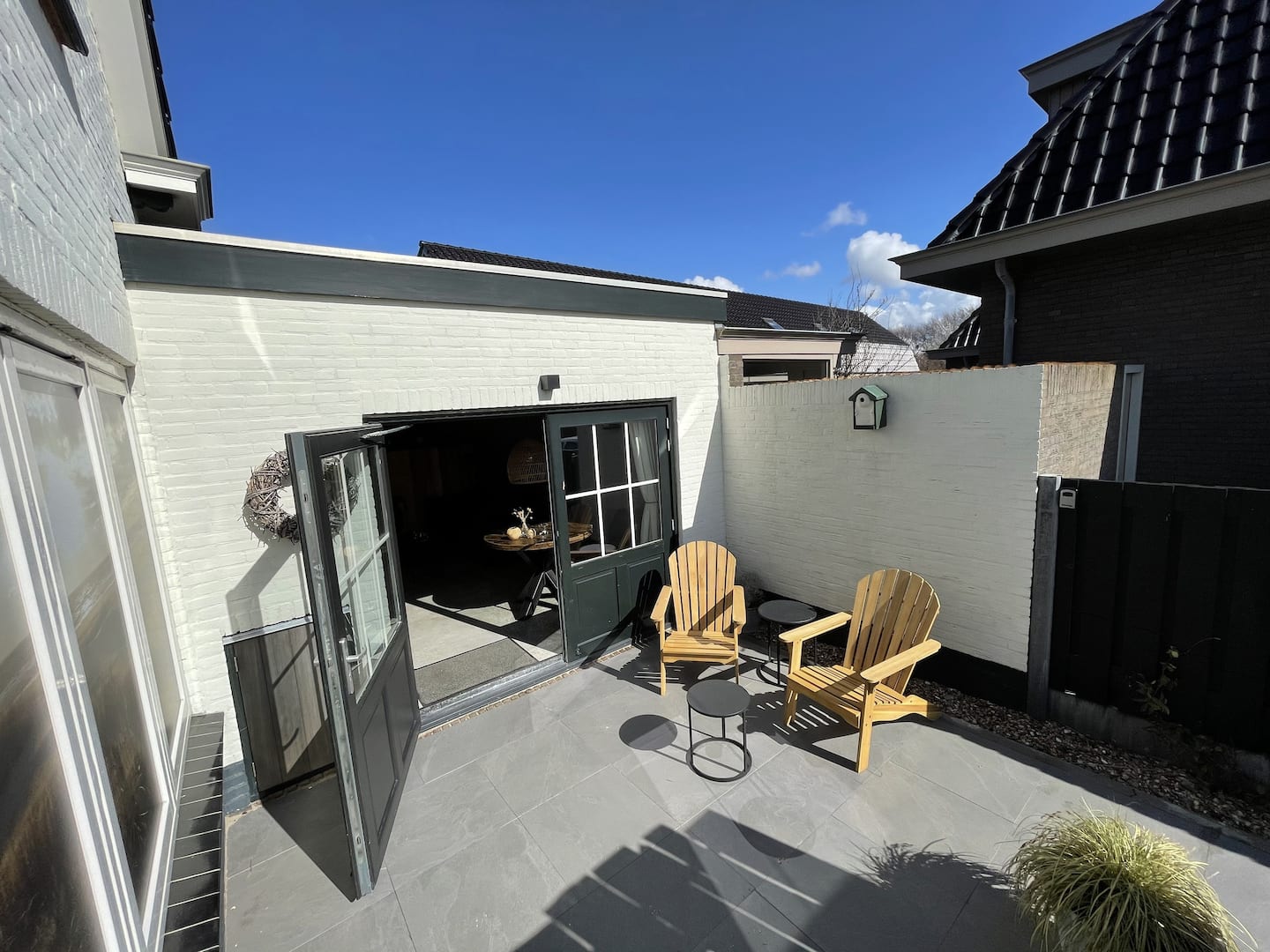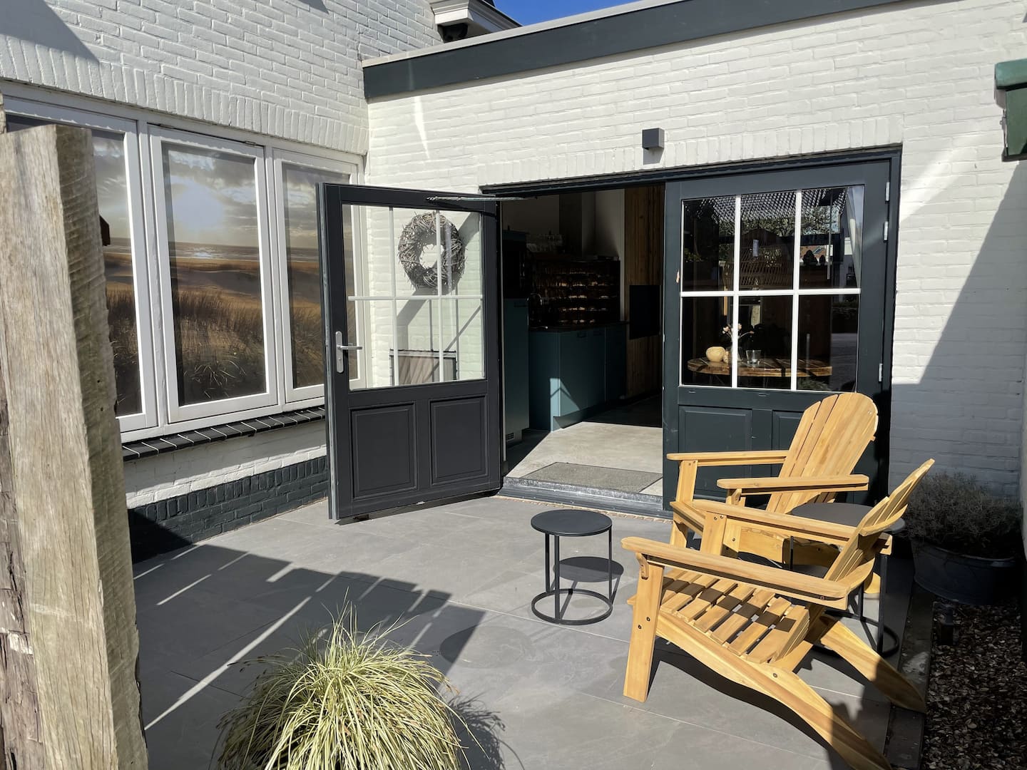 Beide openslaande deuren komen uit op een terras. Aan de voorzijde het terras met fijne lounge stoelen en aan de achterkant het terras met een gezellig zitje.