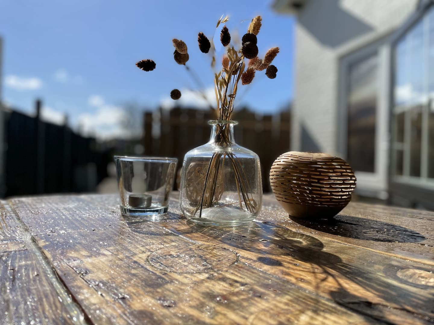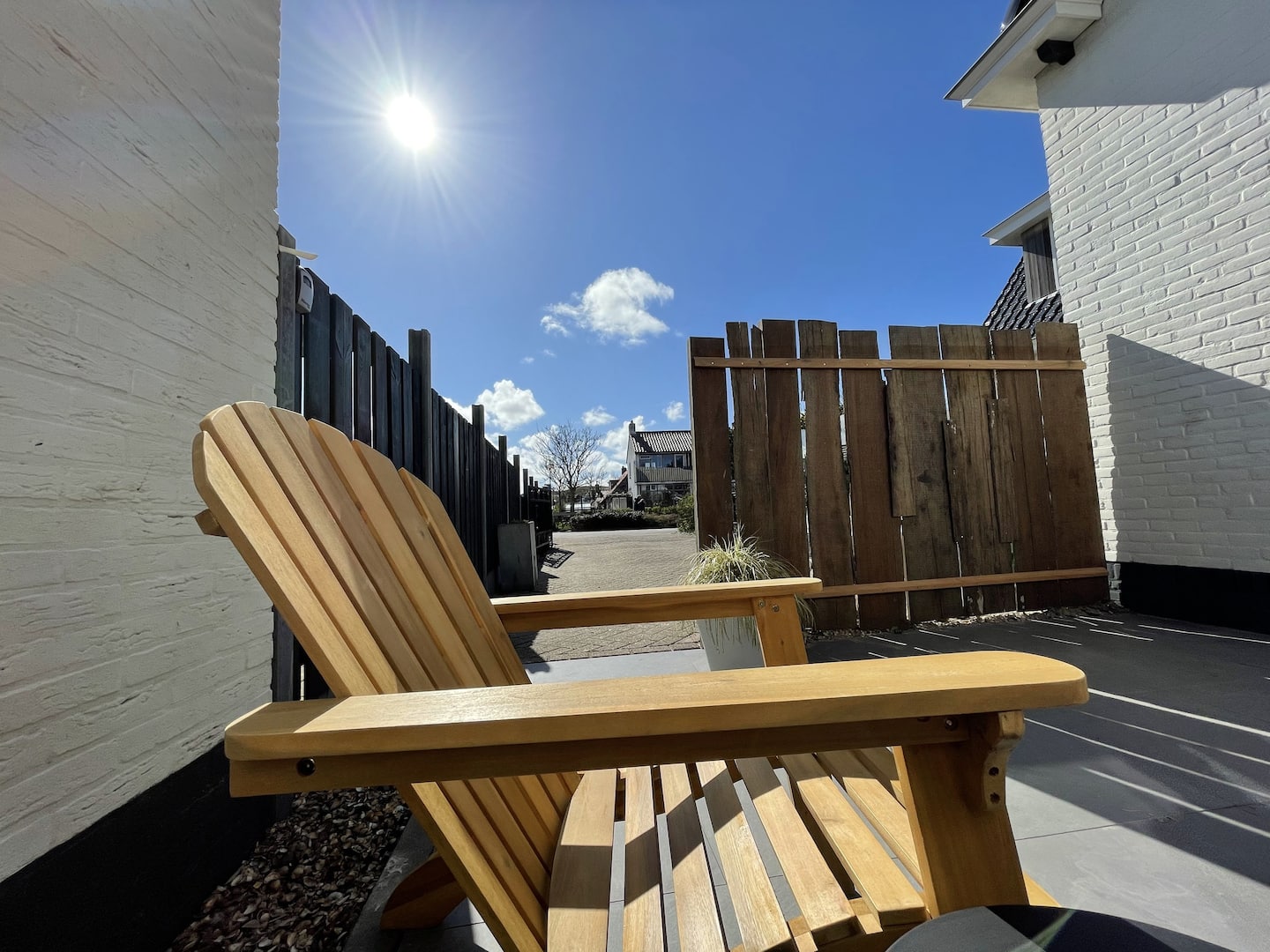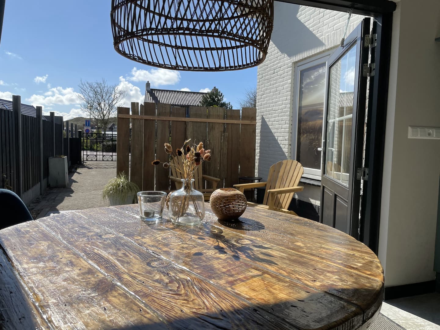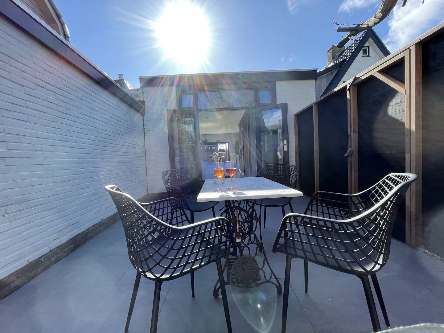 Beide openslaande deuren komen uit op een terras. Aan de voorzijde het terras met fijne lounge stoelen en aan de achterkant het terras met een gezellig zitje.